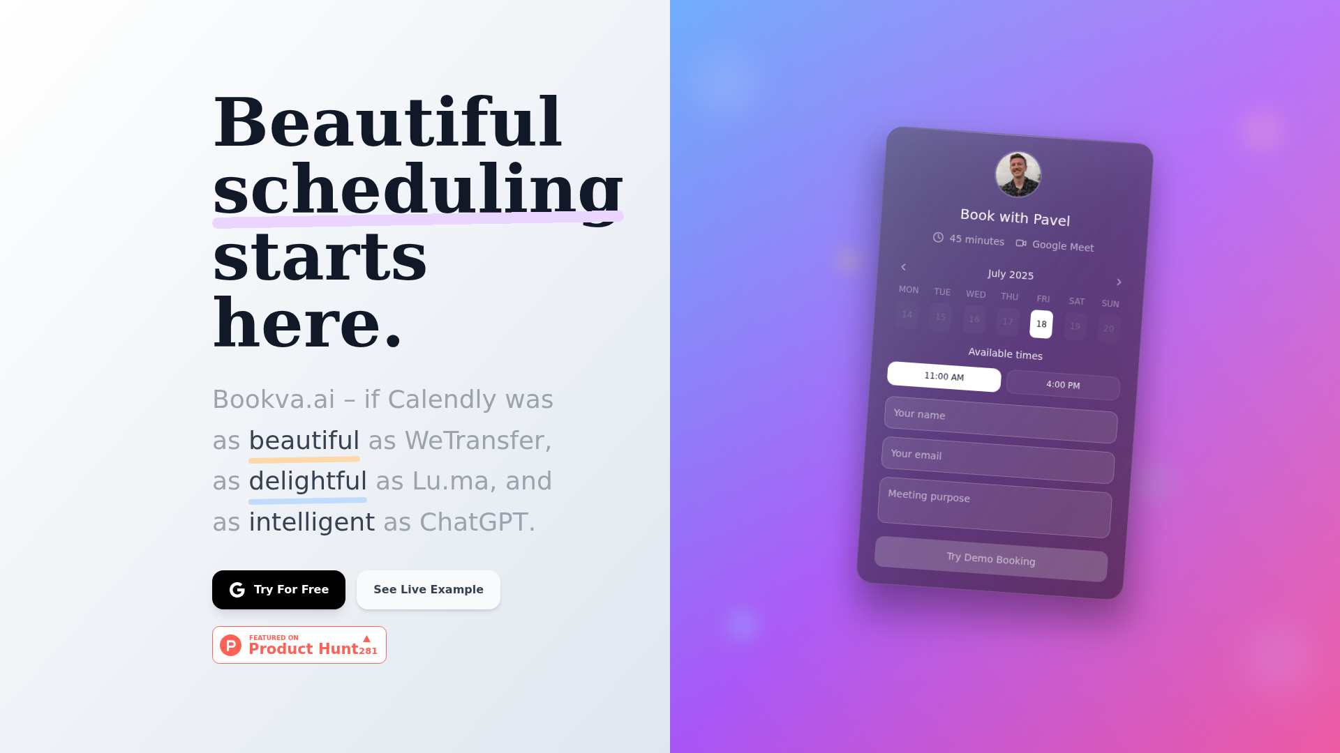 Agende com estilo! ✨ Bookva.ai (2025) combina a inteligência do ChatGPT com a beleza do WeTransfer e a leveza do Lu.ma. Ideal para quem valoriza design e estética. 🎨 Agendamentos inteligentes e visualmente incríveis. Se beleza importa, Bookva! 😉 (Feito em Amsterdam 🇳🇱)