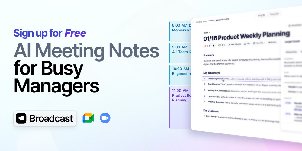 Cansado de reuniões improdutivas e notas dispersas? O Broadcast é um assistente de reuniões impulsionado por Inteligência Artificial, ideal para gestores e equipes de produto que buscam otimizar o tempo e garantir que as decisões sejam acompanhadas.