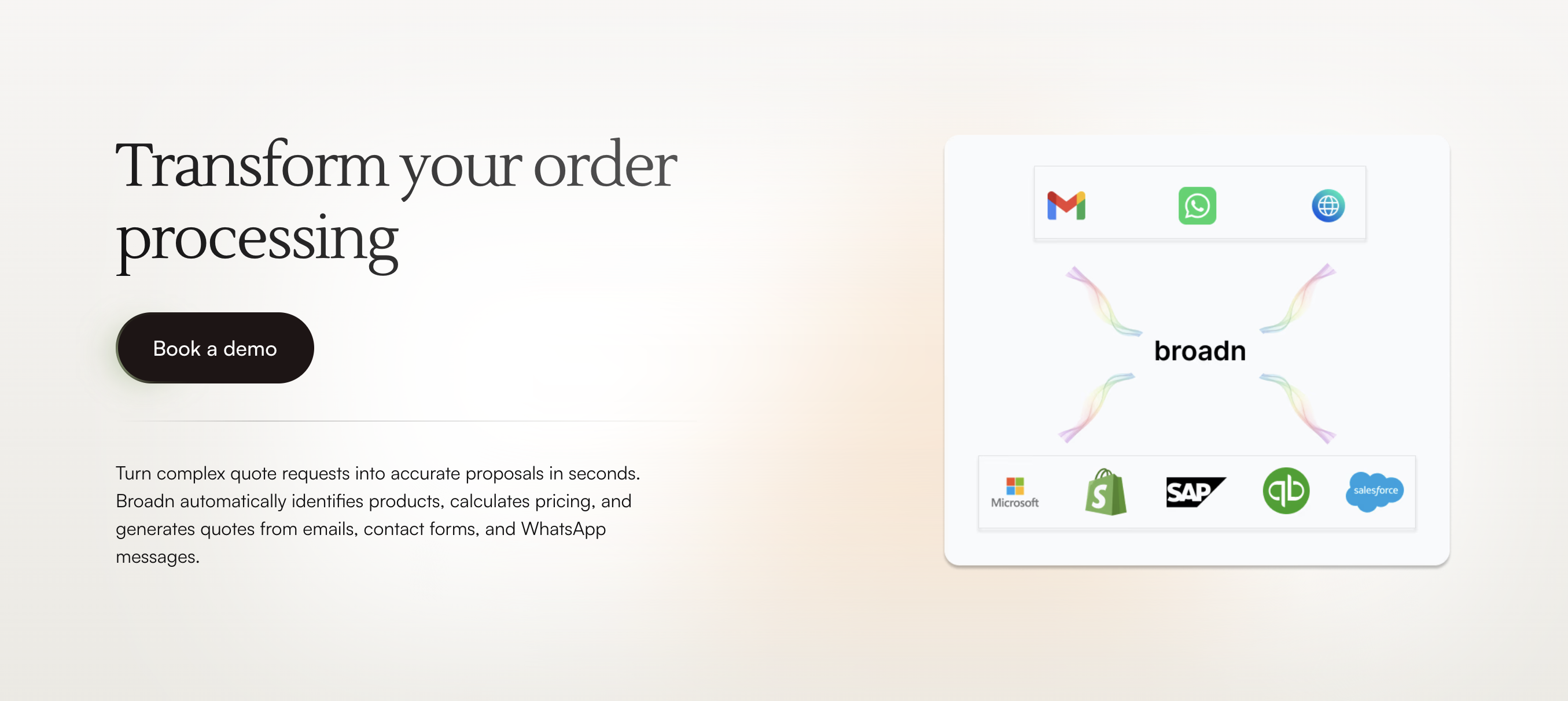 Cansado de tarefas repetitivas e complexas que consomem seu tempo e recursos? A Broadn é uma plataforma de produtividade impulsionada por inteligência artificial que automatiza processos de negócios em diversos canais. Imagine ter um assistente virtual que lida com tarefas demoradas, permitindo que você e sua equipe se concentrem no que realmente importa: a estratégia e o crescimento da sua empresa.