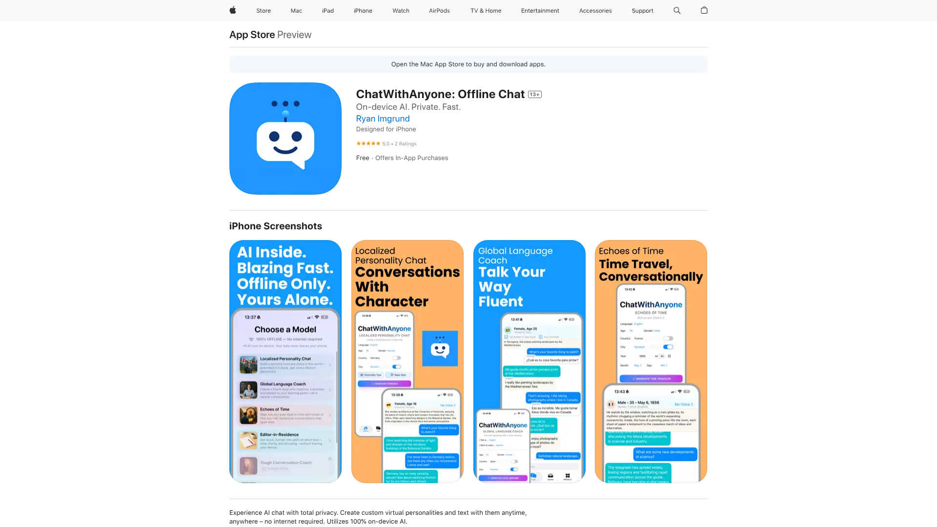 ChatWithAnyone: app iOS 26 📱 exclusiva com LLM da Apple! 🔒 100% privada e rápida, tudo no seu aparelho! 🤖 Crie chats, aprenda idiomas 🗣️, faça role-play 🎭 e tenha ajuda na escrita ✍️ com personas de IA especializadas!