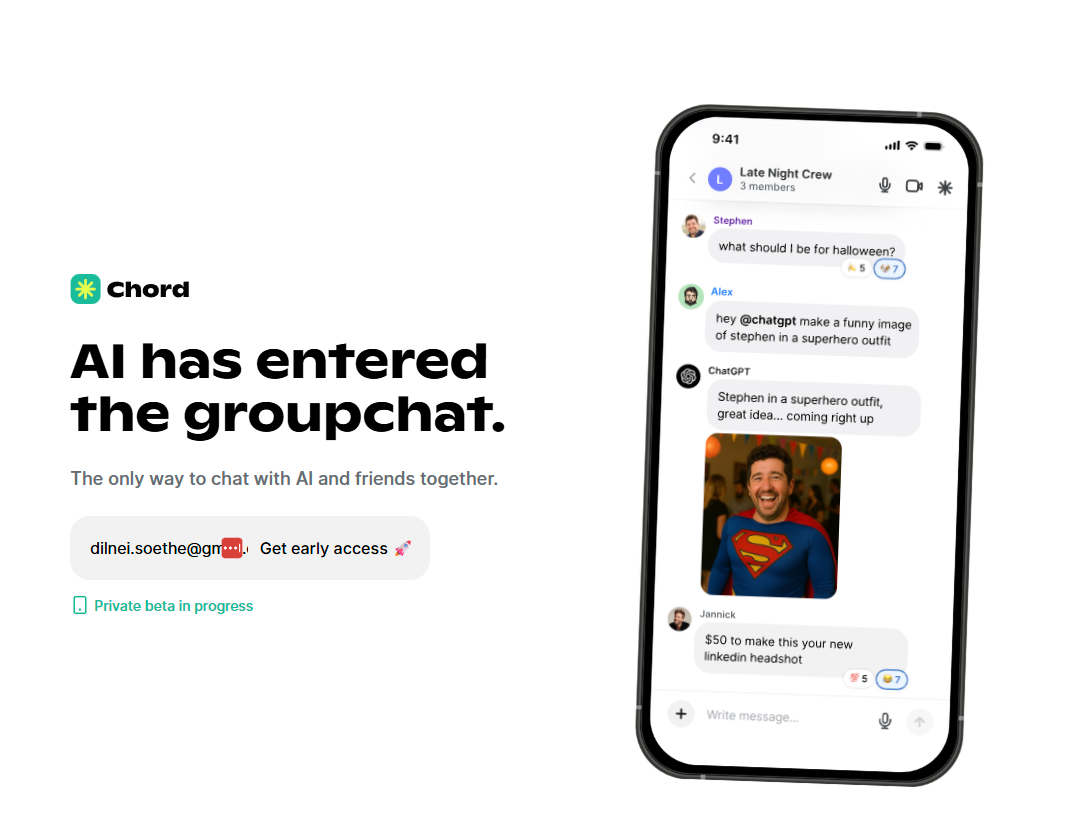 A única forma de conversar com IA e amigos juntos é adicionando bots de IA diretamente nos seus grupos de bate-papo. A IA adiciona superpoderes aos seus grupos, desde ajudar a escolher um restaurante para comer até resolver debates ou simplesmente zoar seus amigos.
