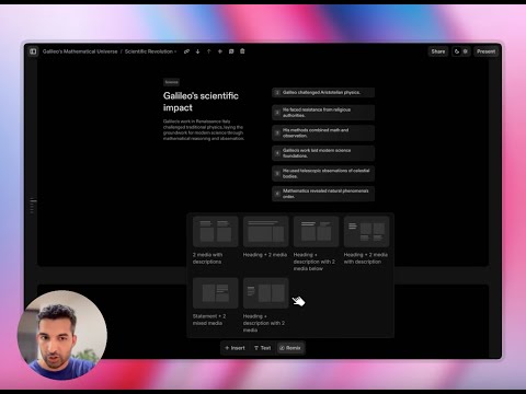 O Chronicle oferece layouts profissionais, sugestões de design inteligentes e até mesmo encontra imagens relevantes para sua apresentação, tudo automaticamente. Basta inserir seu texto e a ferramenta se encarrega do resto, economizando tempo e garantindo um resultado impactante.