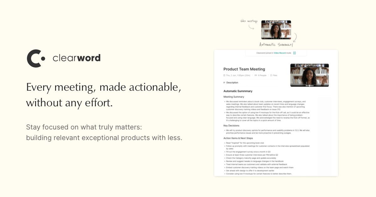 O Clearword se integra facilmente às suas plataformas de videoconferência preferidas e oferece resumos concisos e acionáveis logo após a reunião terminar. Ele identifica automaticamente os participantes, os tópicos discutidos e as decisões tomadas, economizando tempo e garantindo que todos estejam na mesma página.