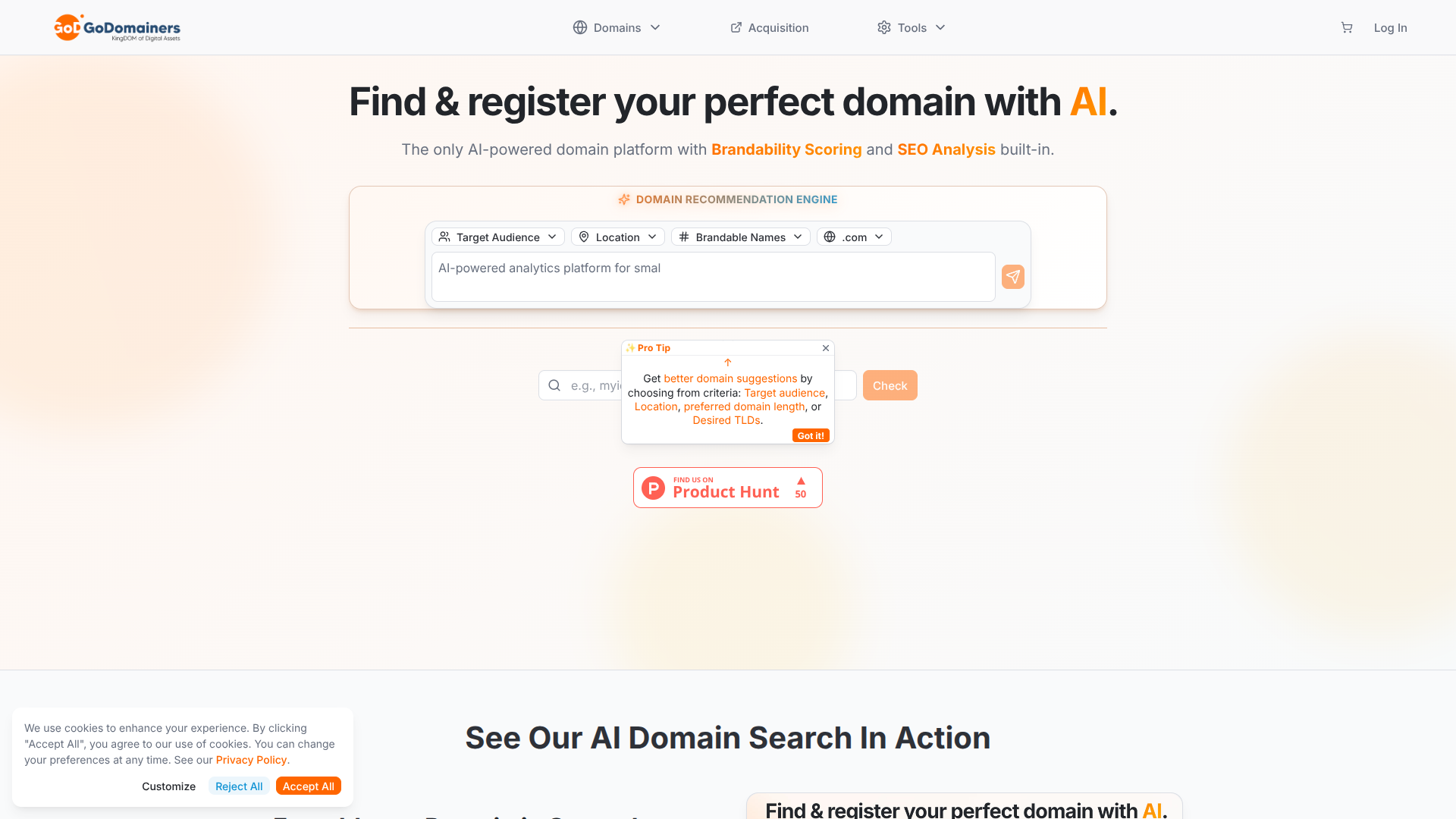 GoDomainers te ajuda a encontrar domínios que realmente se encaixam na sua marca. Obtenha sugestões com tecnologia de IA, com pontuação de "brandabilidade" (potencial de marca), segmentação de público e relevância para o setor — então pesquise, verifique a disponibilidade e garanta seu domínio perfeito em um fluxo contínuo.