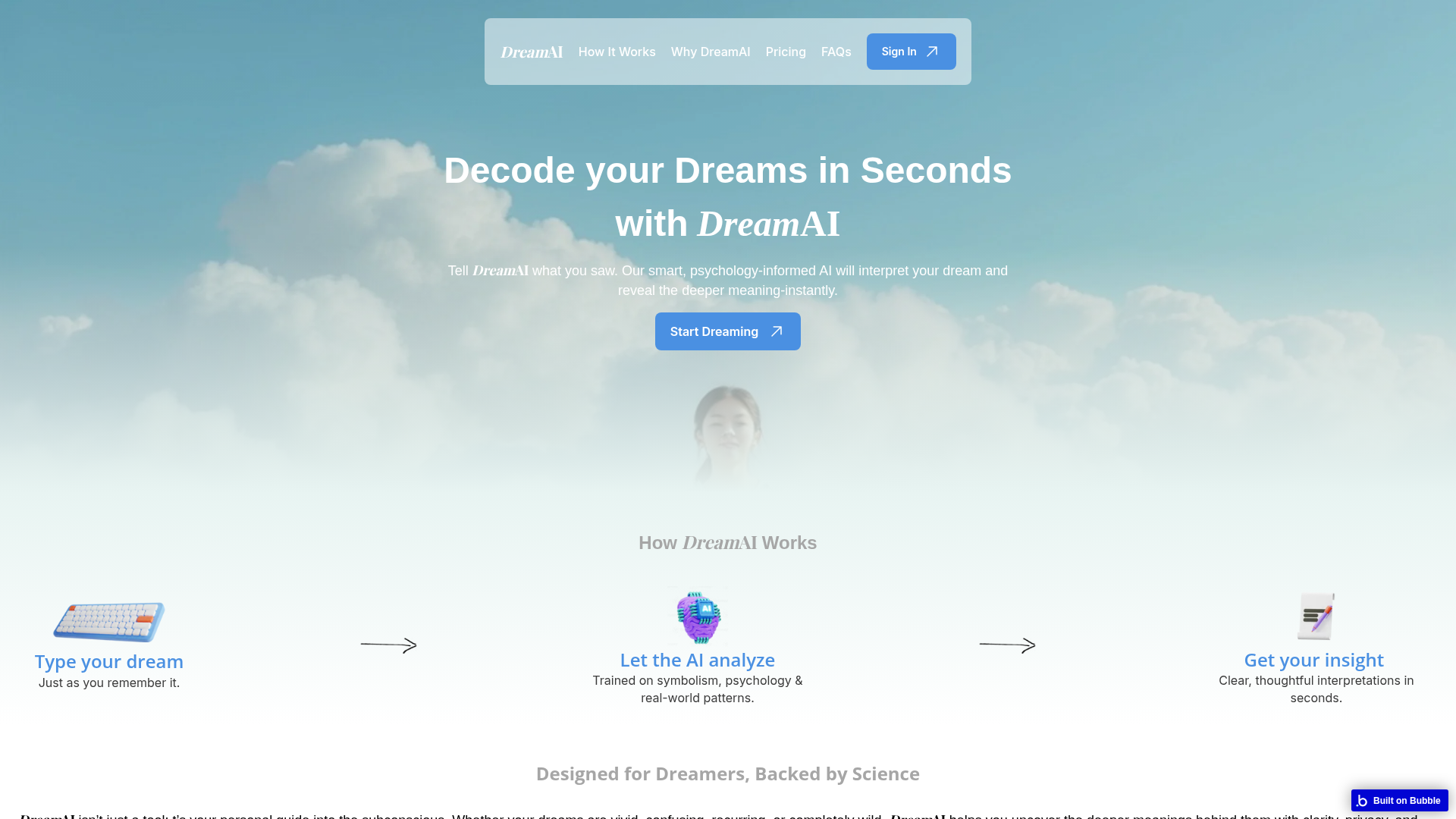 DreamAI te ajuda a interpretar seus sonhos com insights impulsionados por IA. Simplesmente descreva seu sonho e obtenha interpretações significativas, temas e padrões — tudo em uma interface linda e intuitiva.