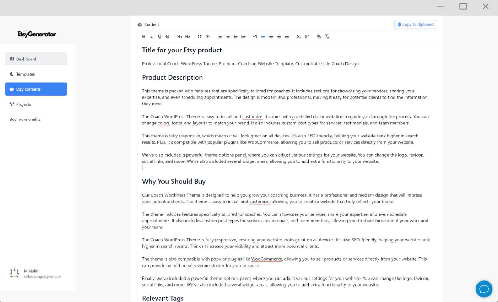 O EtsyGenerator é perfeito para artesãos, criadores e vendedores que desejam aumentar a visibilidade de seus produtos e atrair mais clientes no Etsy. Ele analisa seus produtos e gera automaticamente descrições que destacam os benefícios, usam palavras-chave relevantes e otimizam seu posicionamento nos resultados de busca do Etsy.