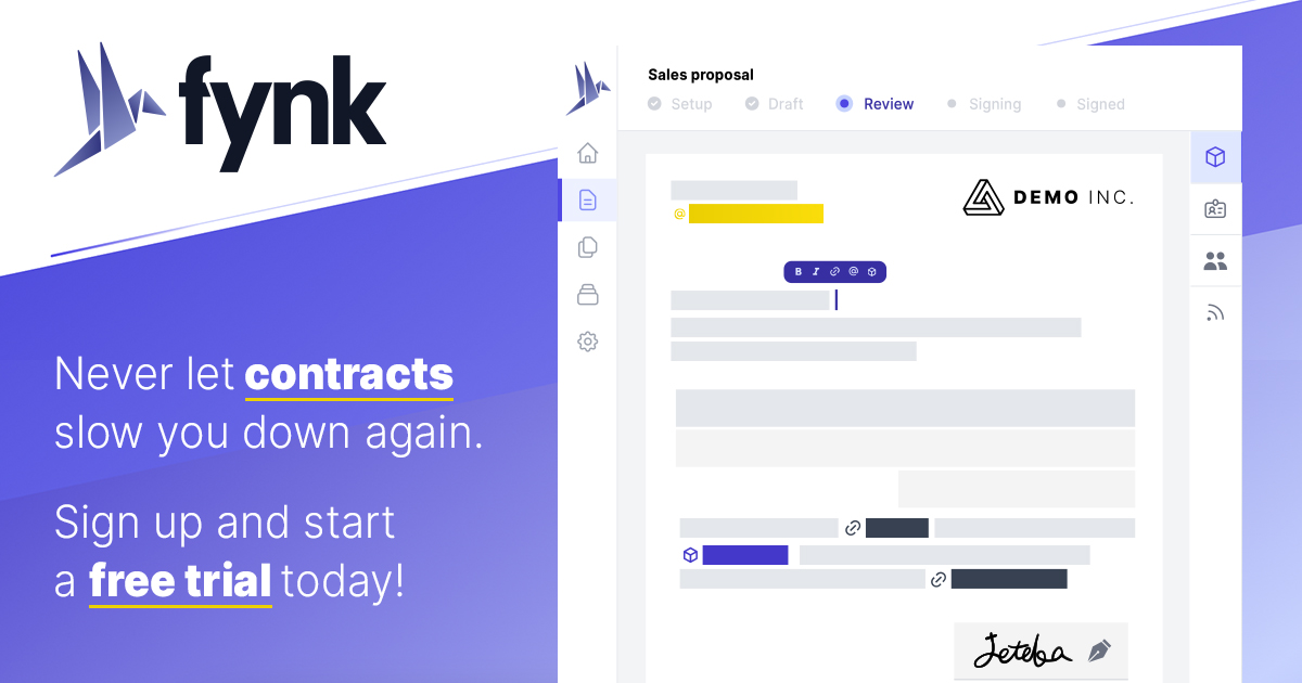 Cansado da papelada e da complexidade na gestão de contratos? A Fynk é uma solução de software completa projetada para simplificar e otimizar o ciclo de vida dos contratos para empresas na Europa. Imagine ter todos os seus contratos em um só lugar, fáceis de encontrar, gerenciar e renovar.