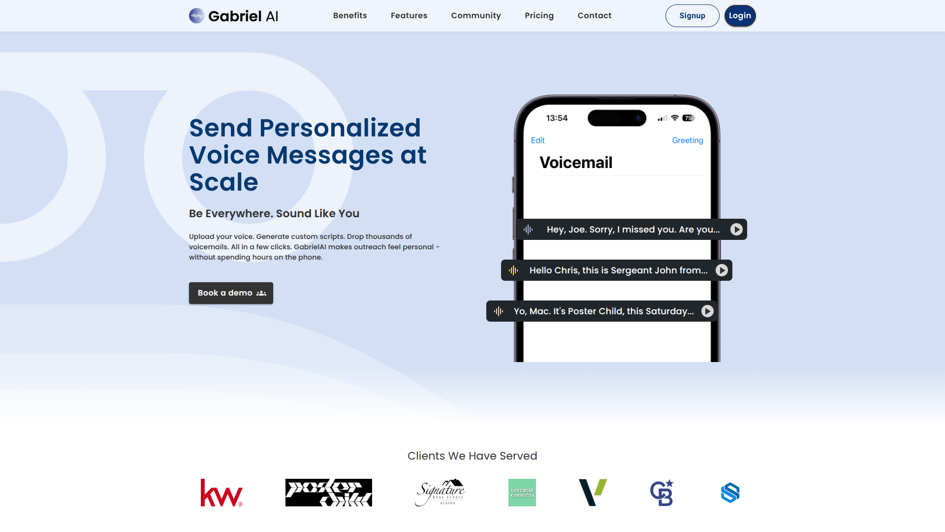 Gabriel AI é a maneira mais rápida de escalar o alcance personalizado. Deixe centenas e milhares de mensagens de voz, personalize cada uma com dados e conecte-se de forma autêntica em diversos setores.