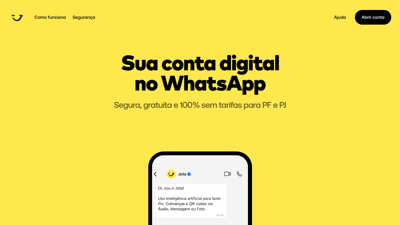 O Jota é uma conta digital que opera inteiramente pelo WhatsApp, usando inteligência artificial para processar comandos por texto, áudio ou imagem. Imagine um assistente virtual que entende quando você manda a foto de um boleto ou pede para fazer um Pix - tudo isso sem precisar baixar mais um aplicativo no celular.
