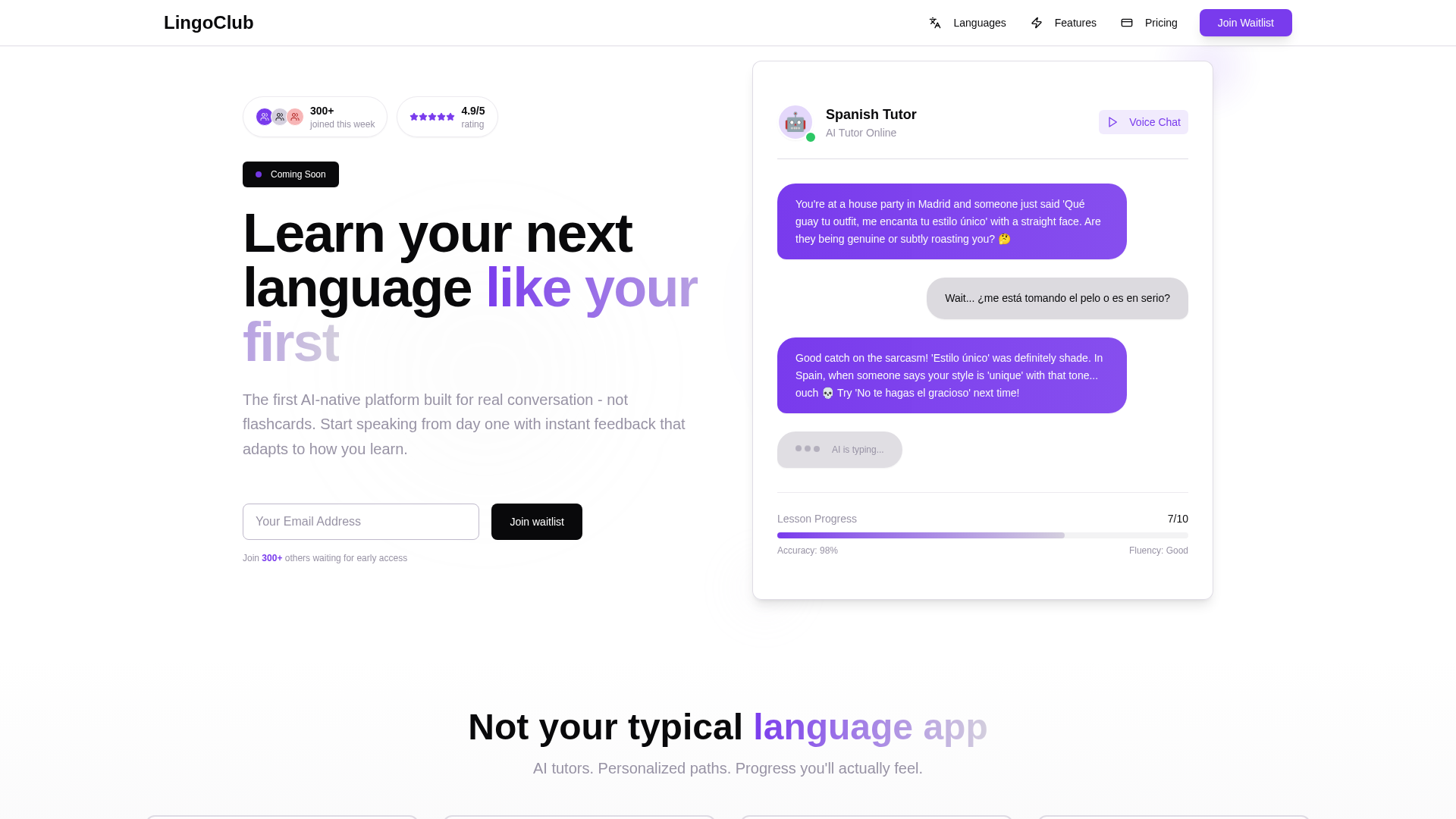 A primeira plataforma de idiomas nativa em IA construída em torno de conversas reais. Sem flashcards, sem memorização - apenas prática de conversação natural com feedback instantâneo do seu tutor de IA. Ela se adapta à sua forma de aprender, para que você possa começar a falar desde o primeiro dia.