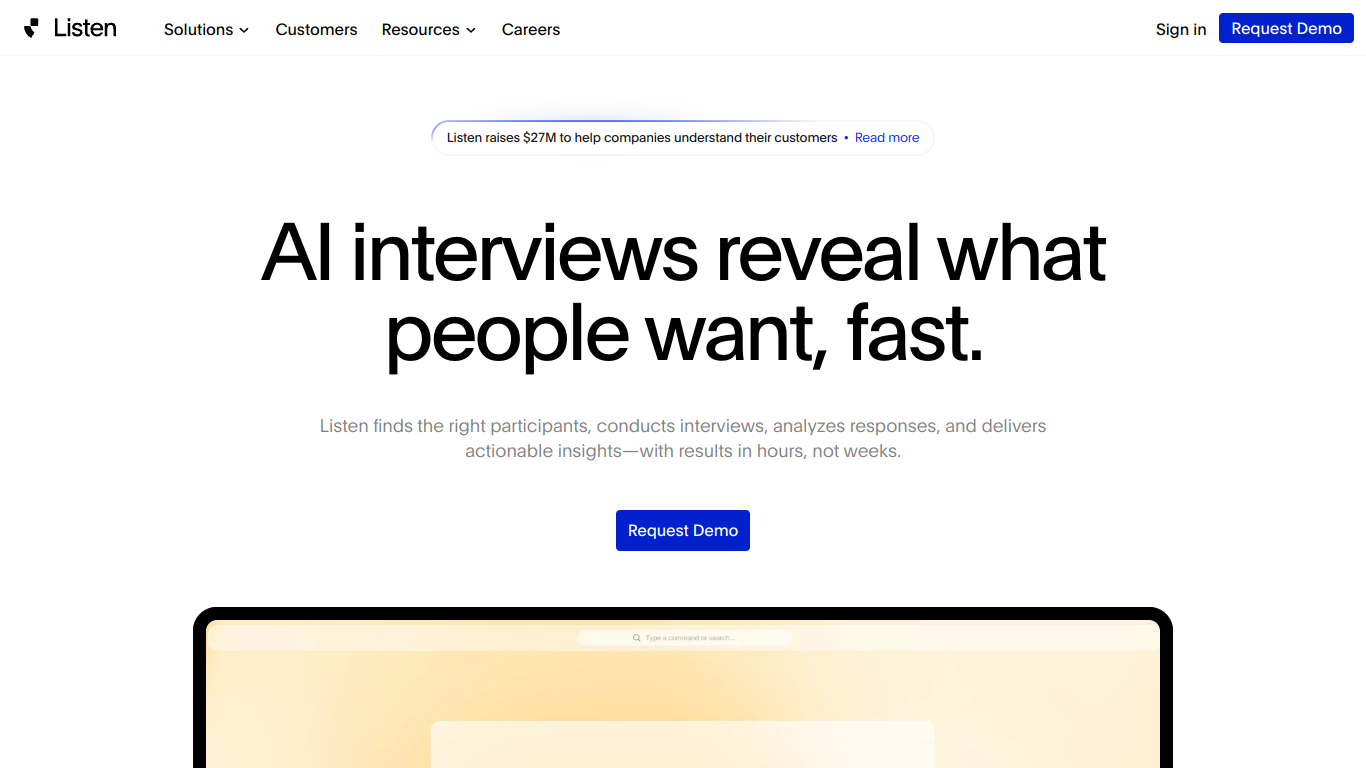 Imagine poder identificar rapidamente as principais tendências de mercado a partir de entrevistas com clientes, entender as necessidades dos seus consumidores através de ligações de atendimento, ou otimizar suas estratégias de vendas analisando o desempenho das suas equipes. O Listenlabs AI permite tudo isso e muito mais!