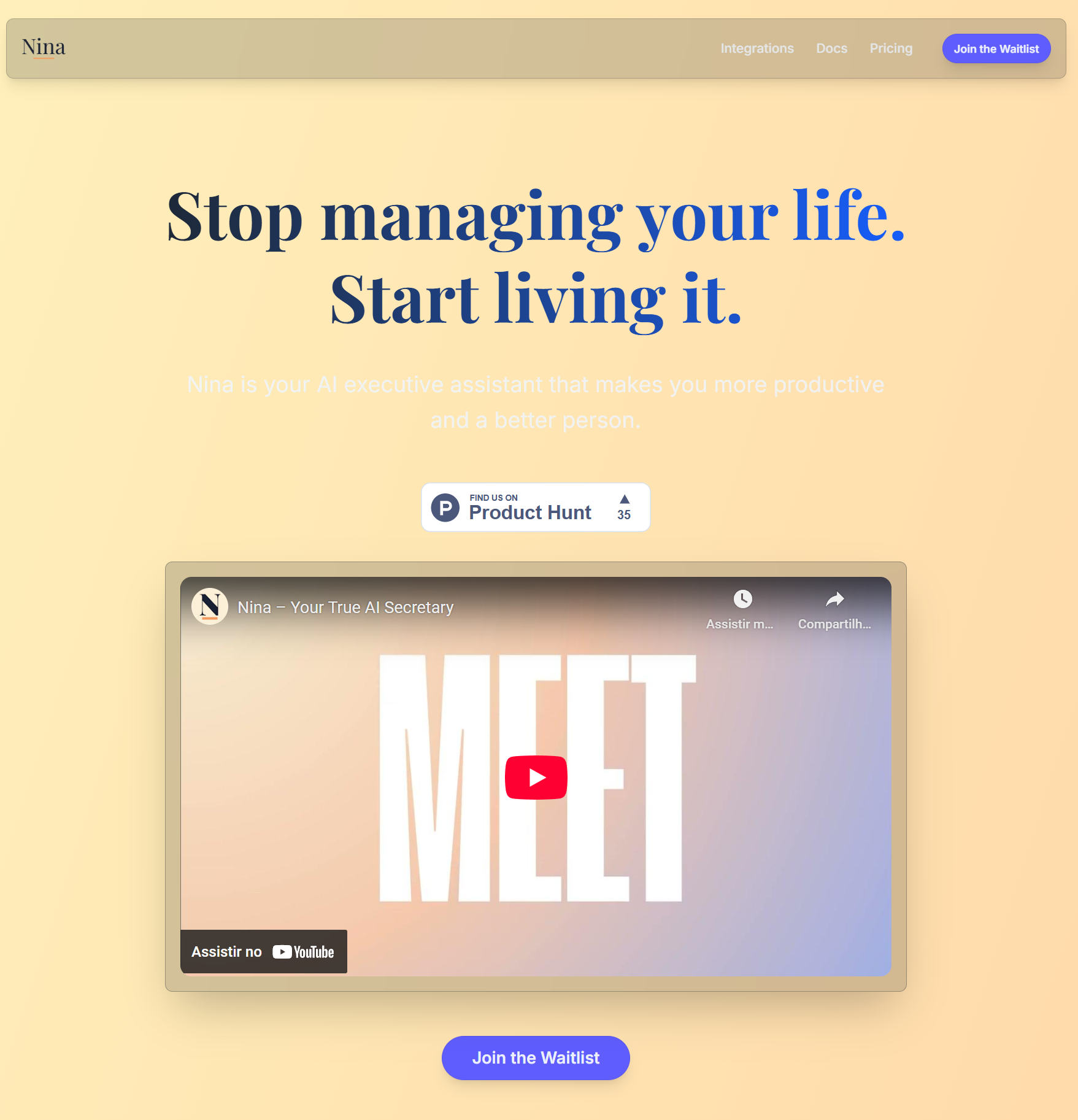 Nina é uma assistente pessoal de IA que lembra o que importa, integra-se com qualquer ferramenta e cuida das coisas chatas para que você possa se concentrar no que realmente importa. Agende reuniões, reserve restaurantes, envie lembretes e muito mais, tudo a partir de um hub inteligente e contextual.