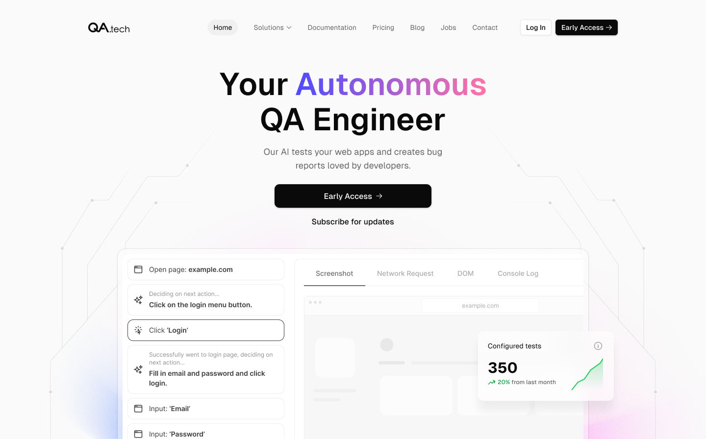 QA.tech é uma plataforma inovadora que utiliza inteligência artificial para simplificar e automatizar o processo de testes end-to-end (E2E) em aplicações SaaS B2B. Imagine poder testar a fundo seu software sem a necessidade de horas de programação manual e repetitiva!