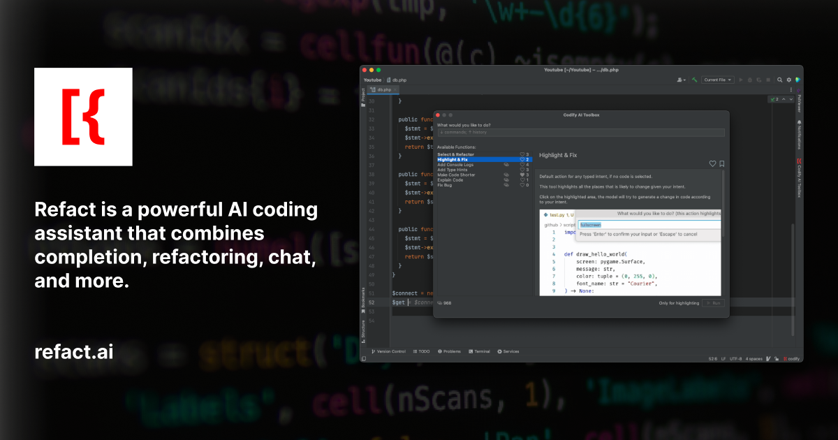 Refact.ai é um assistente de codificação baseado em inteligência artificial, hospedado na nuvem, que visa turbinar a produtividade de desenvolvedores. Imagine ter um parceiro que sugere complementos de código incrivelmente rápidos e oferece melhorias poderosas para o seu código, tudo isso enquanto aprende com seu estilo individual de programação.