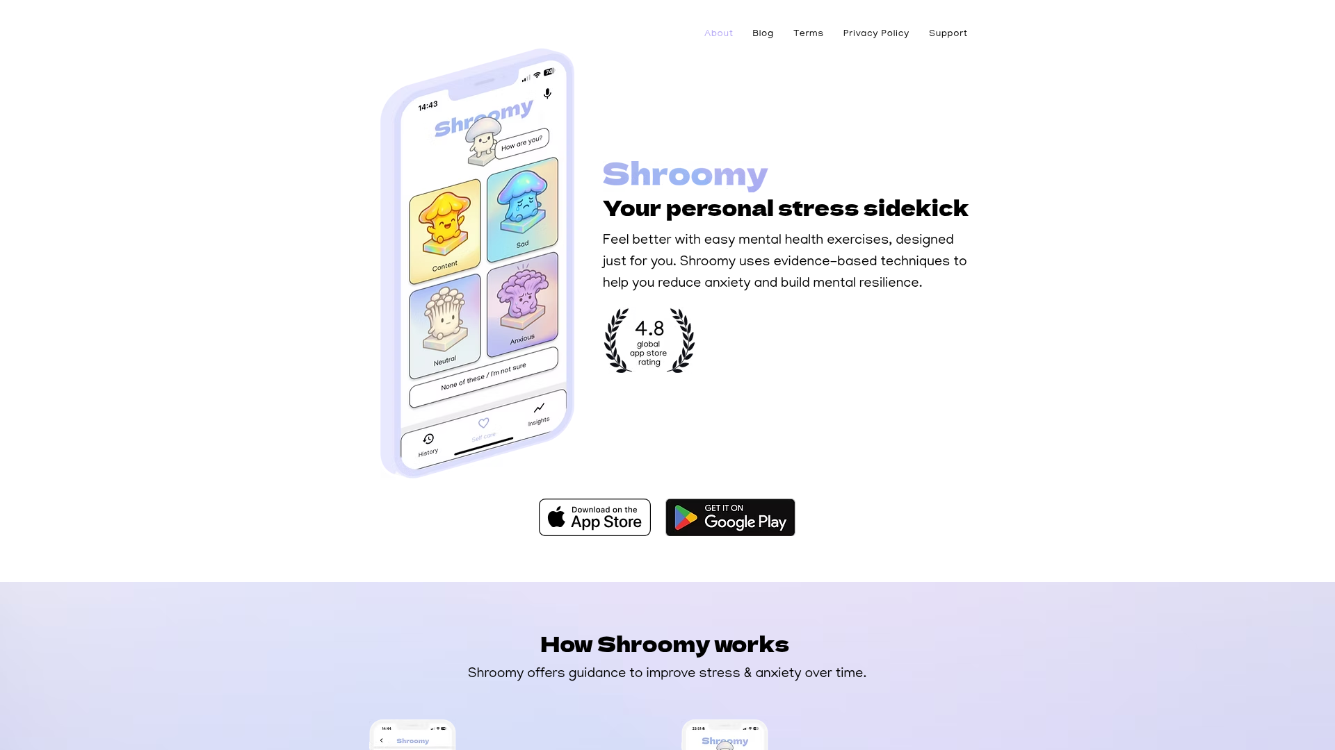 Sinta-se melhor com exercícios diários de saúde mental, criados especialmente para você. Shroomy é um companheiro de IA que usa técnicas baseadas em evidências para te ajudar a reduzir a ansiedade e construir resiliência mental.