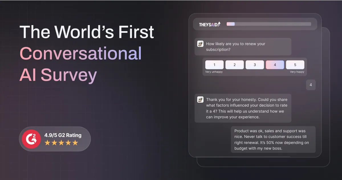 O TheySaid oferece uma experiência mais amigável e intuitiva, resultando em taxas de resposta mais altas e dados mais ricos e relevantes. Com a IA, a plataforma adapta as perguntas com base nas respostas anteriores, criando um fluxo personalizado e direcionado.