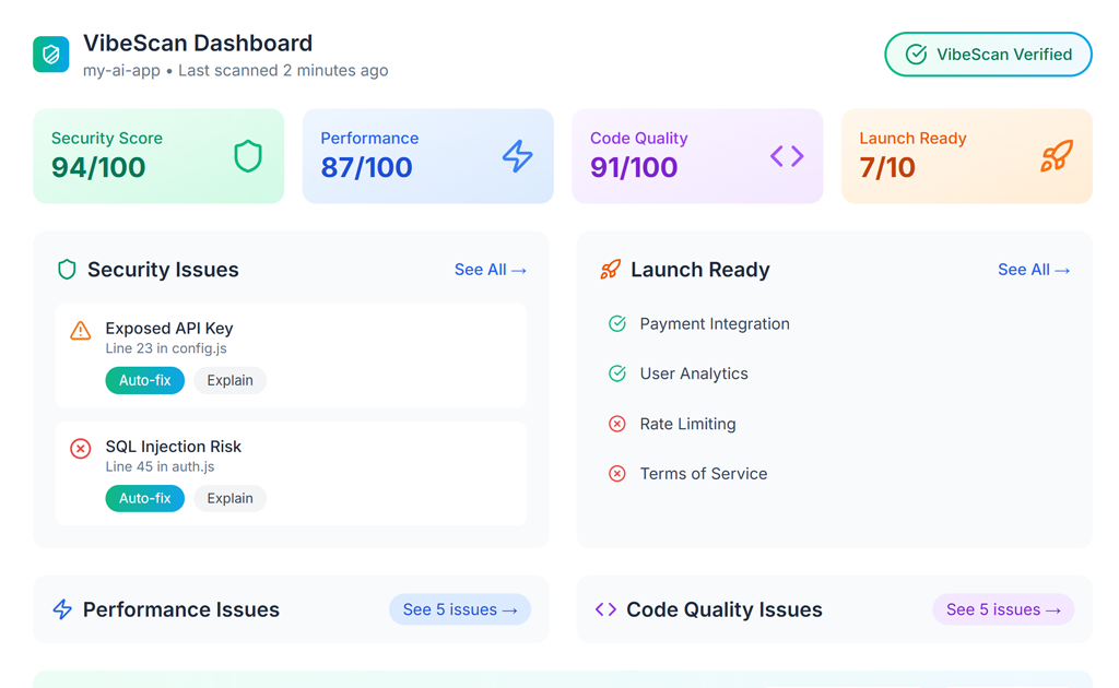 Cansado de se preocupar com vulnerabilidades e problemas de performance no código que sua IA gera? Apresentamos o VibeScan, uma plataforma inteligente que usa inteligência artificial para analisar e corrigir automaticamente o código produzido por modelos de IA.