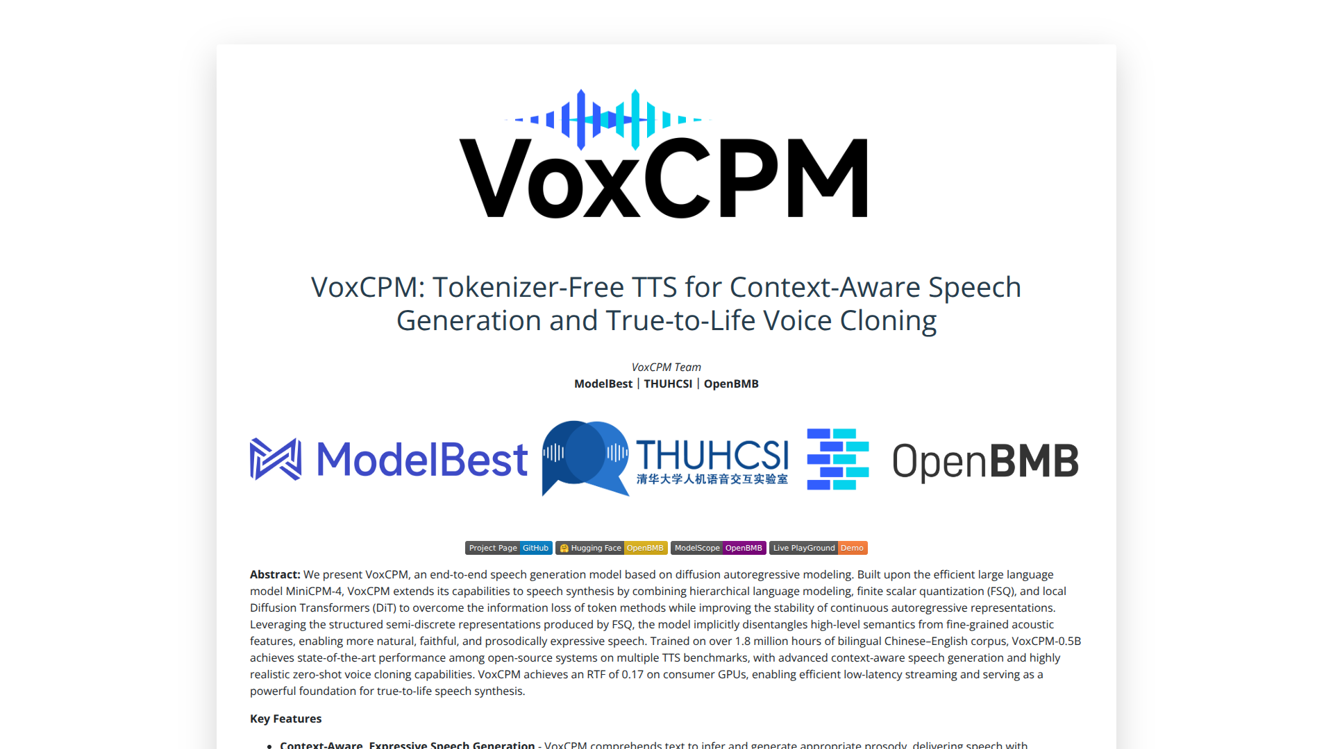 VoxCPM é um novo modelo de TTS de código aberto e livre de tokenização. Ao modelar a fala em um espaço contínuo, ele supera as limitações de tokens discretos para entregar uma geração de fala altamente expressiva e consciente do contexto, além de uma clonagem de voz zero-shot incrivelmente realista.